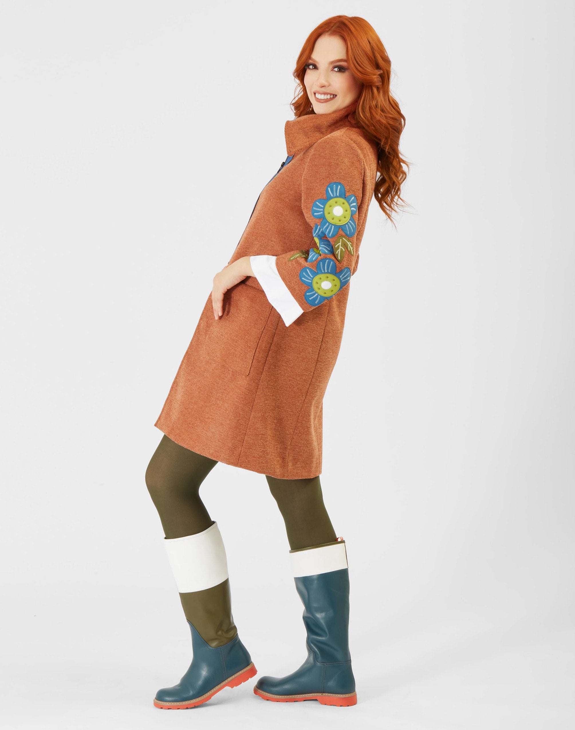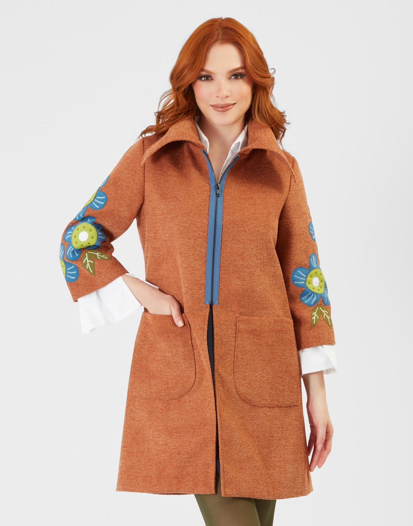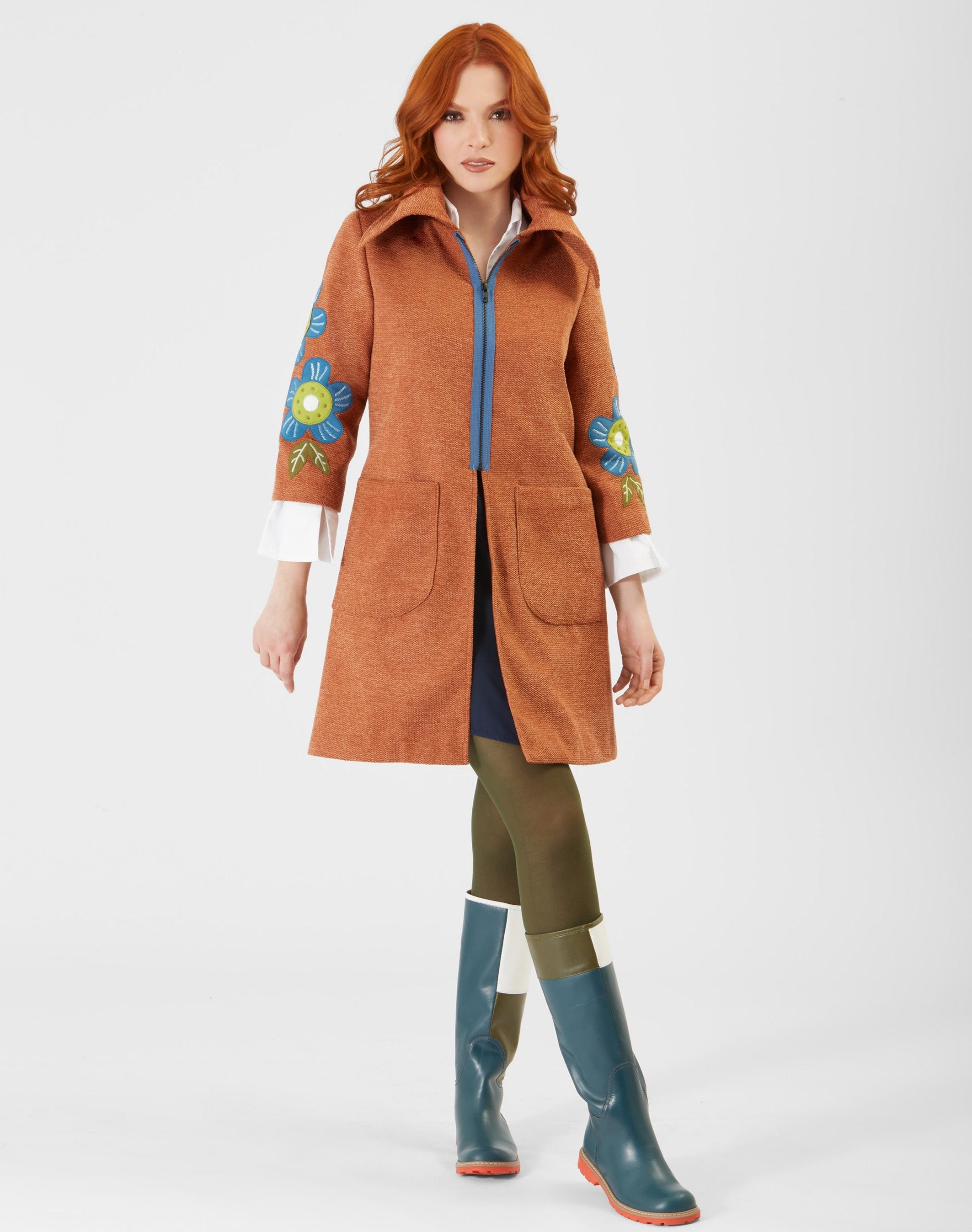 Bold wide collar, plated closure with an overlay in a matching color, and lightweight contrasting lining. Large front pockets.