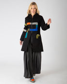 Lo más llamativo es la figura de una serpiente que recorre toda la prenda a través de apliques y bordados. Su cuerpo sinuoso se forma con una mezcla de textiles que contrastan vibrante y armónicamente con el fondo negro del abrigo: bloques de color en azul eléctrico, naranja, verde oliva, negro con lunares blancos, y un clásico gallineto. Cada tramo de la serpiente revela texturas y prints únicos, logrando un equilibrio visual sofisticado y lúdico.