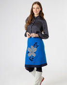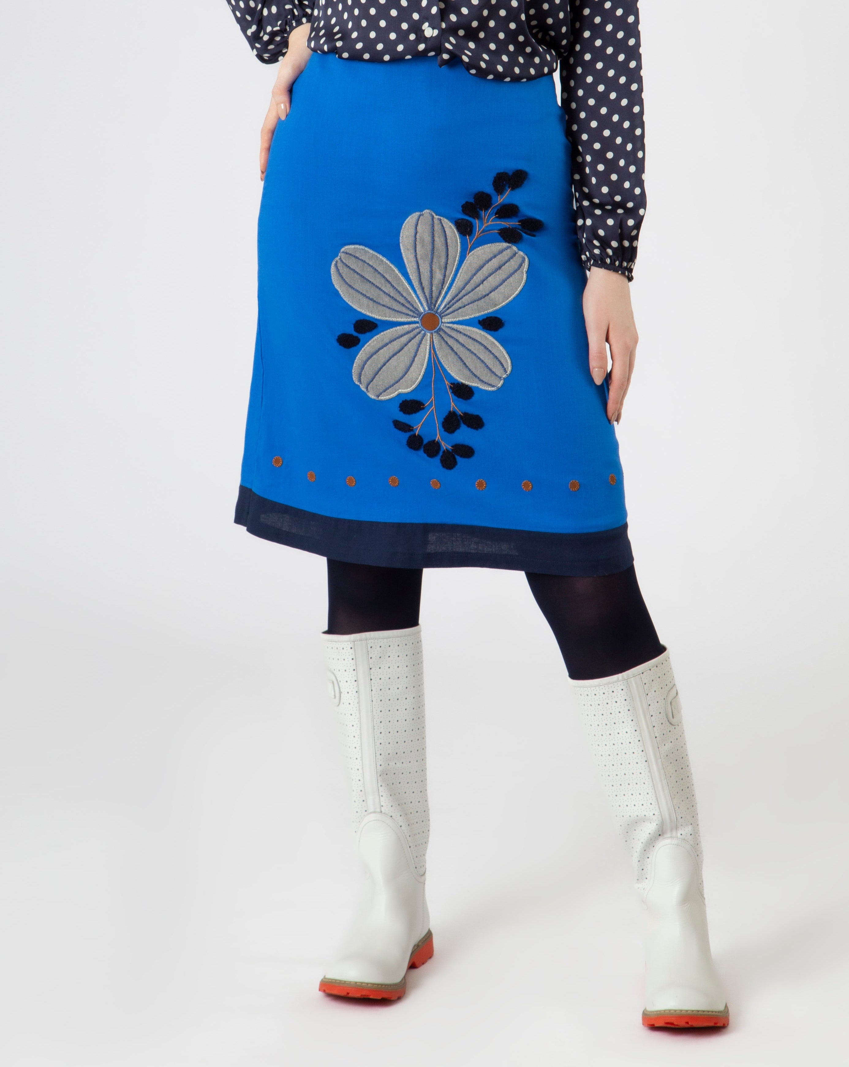 Falda en lino azul intenso con aplique de enrome flor con mezcla textil y bordados mixtos, plano y chenille.