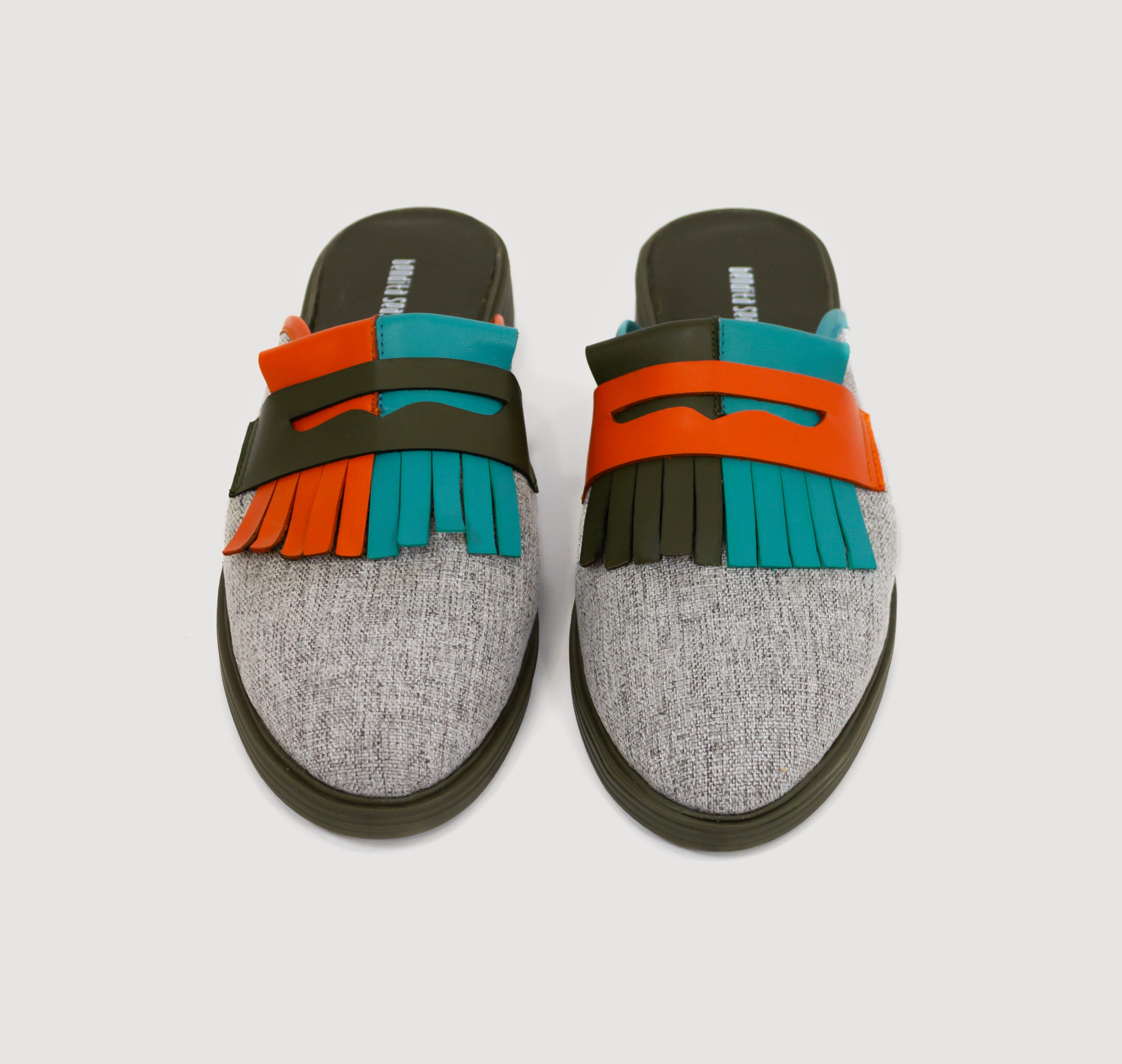 Crafted from cloud gray microfiber fabric with two-tone leather tassels. Each shoe features a mismatched design, yet perfectly coordinated as a pair! Finished with a semi-flat military green rubber sole for optimal comfort.
